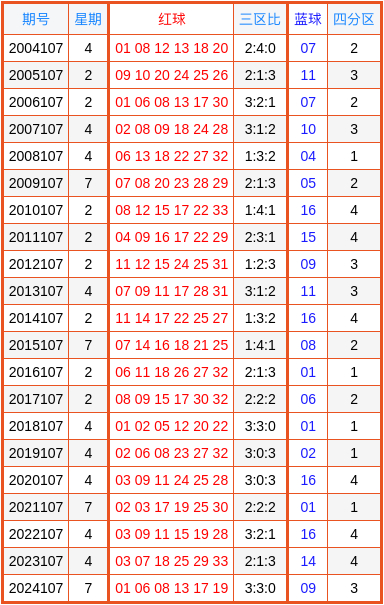 一区奖号【01-11】:在历年双色球第107期同期奖号中,该区开出率为35.71%,表现一般,与理论概率相近。本期预计该区出号1枚,推荐出号关注:07。