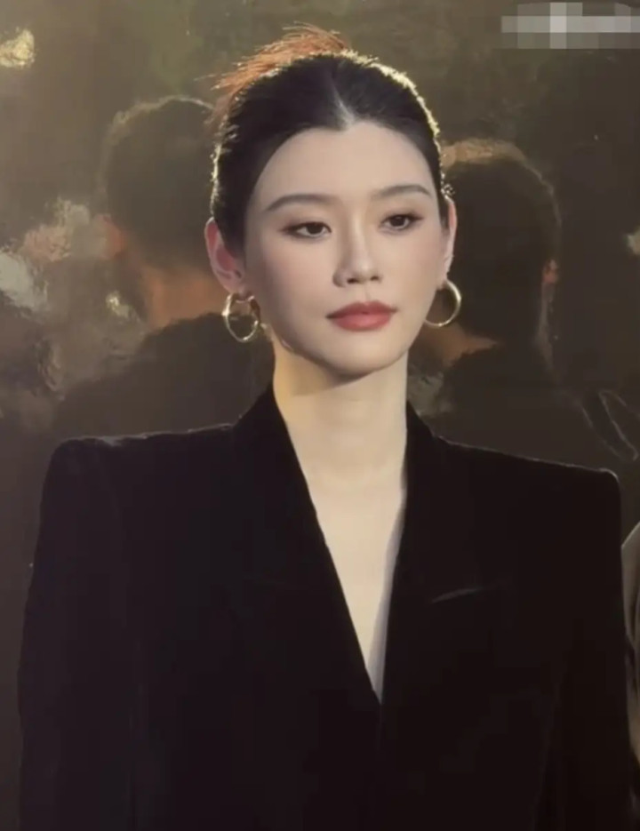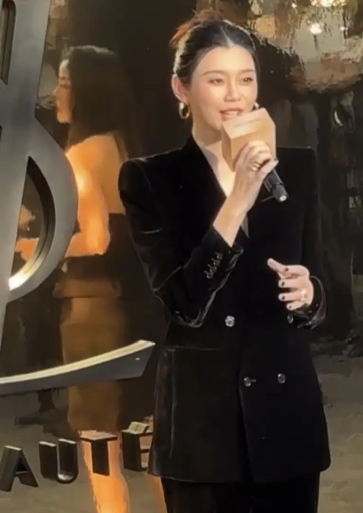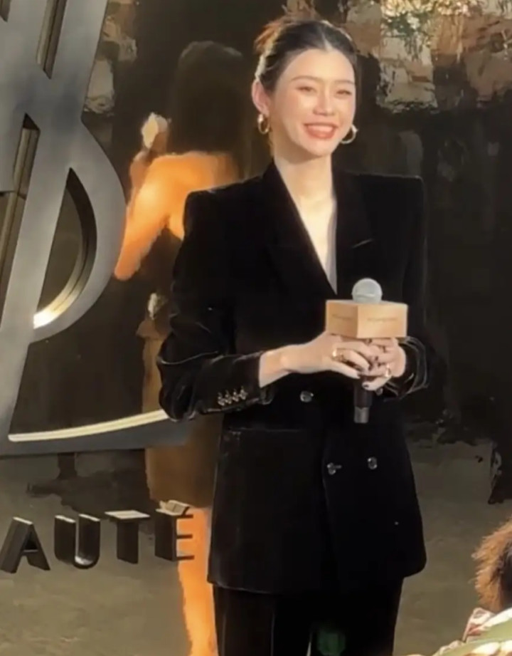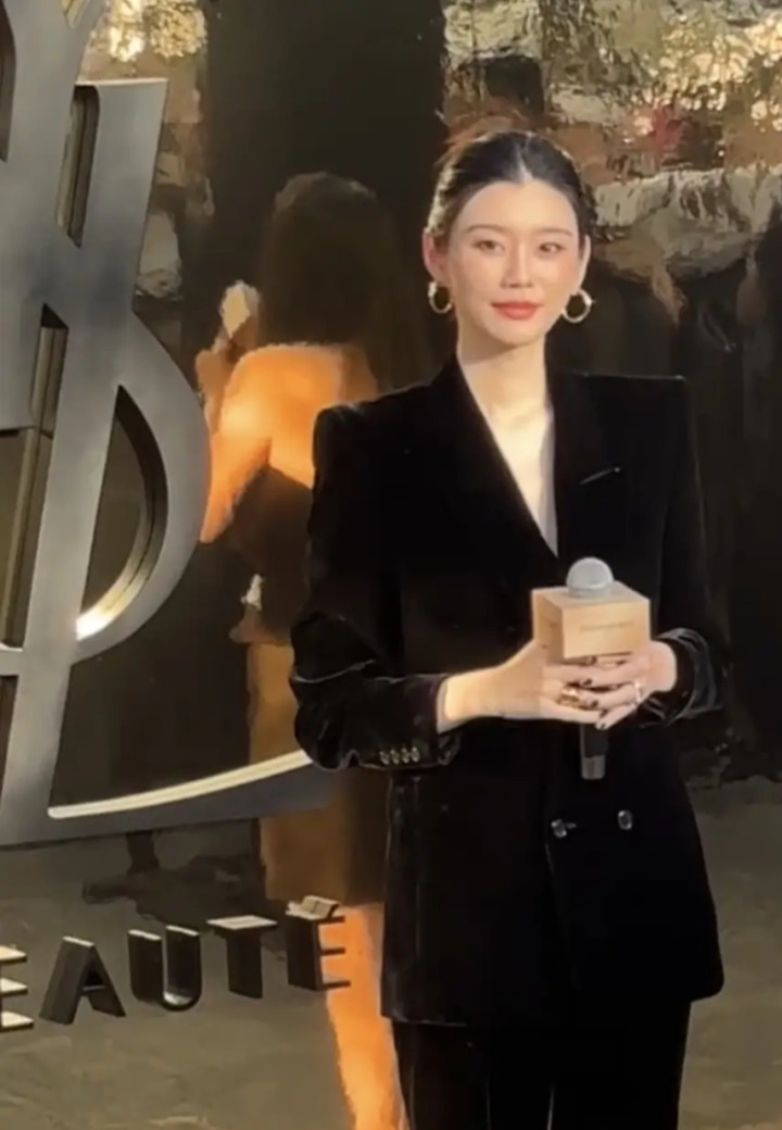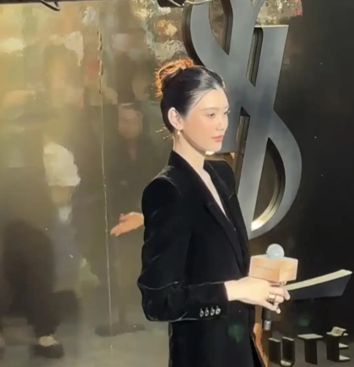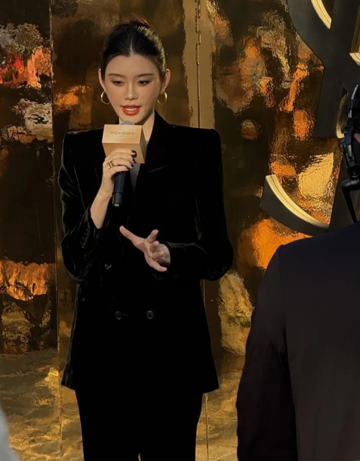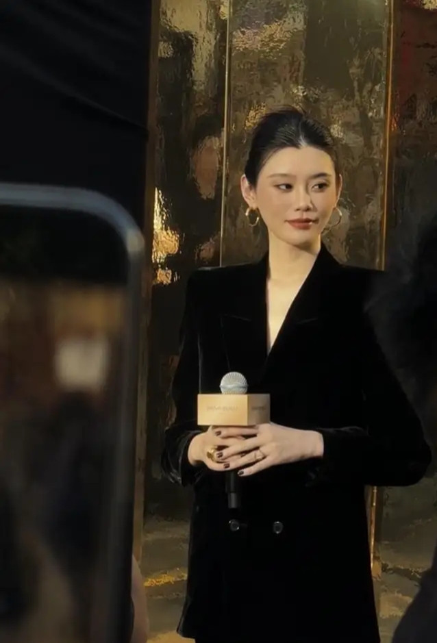 奚梦瑶丝绒西装造型亮相太古里, 优雅高级感尽显