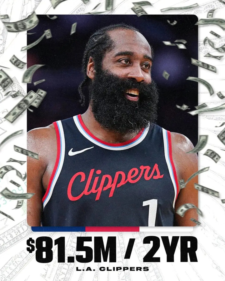 除了杜兰特,曾经的雷霆三双中的另一位哈登在之前和76人续约的时候,不仅放弃了4730万美元的球员选项,而且也选择了降薪,只签下了一份2年6860万美元的合同,年薪才只有3000多万。当时很多人都认为哈登只拿这么多钱确实太便宜了。
