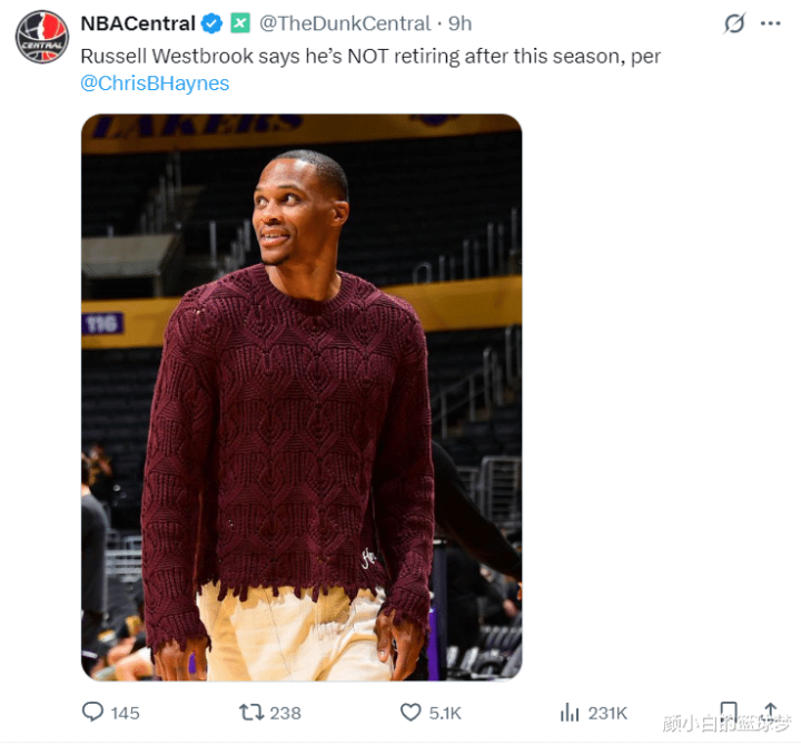 根据克里斯-海恩斯的报道,威少无意在新赛季结束后退役,这或许已经是少爷最后的倔强了。