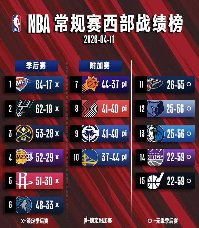11日常规赛排名观察:火箭锁定第五 快船跌到第九