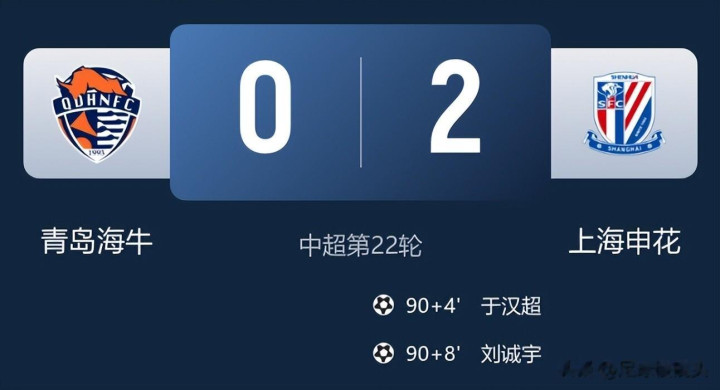 中超联赛第22轮,青岛海牛坐镇青岛青春足球场迎战上海申花。上半场兰克尔-泽头球险些破门,安德烈-路易斯也有一次精彩头球被扑出,阿苏埃超级远射被吹,两队暂0-0战平;下半场阿苏埃补射破门再次被判越位,于汉超补时破门,刘诚宇锁定胜局,最终青岛海牛0-2上海申花,申花先赛一场暂时2分领跑,青岛海牛仍在降级区。