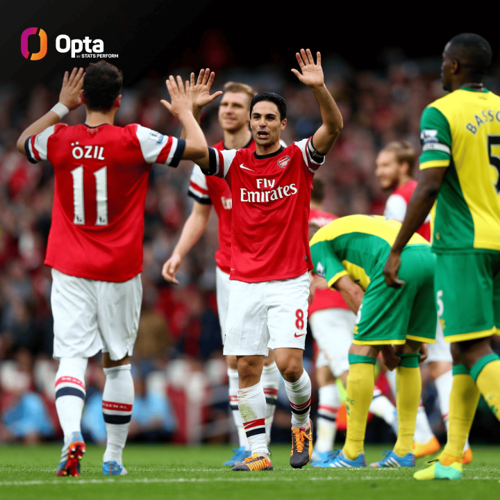 根据数据网站Opta的统计,阿森纳队史逆转取胜的英超比赛中,本场梅里诺的扳平进球是第二晚的——最晚的扳平进球则来自2013年4月球队对阵诺维奇的比赛。